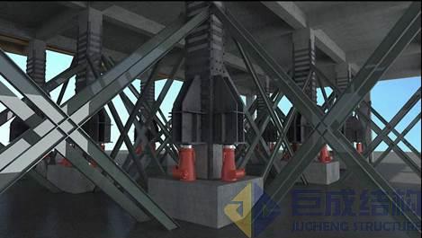 針對現有建筑增層改造技術施工周期長、造價高、易出現事故等缺陷,提供一種鋼滑道頂升增層的技術,其主要特征在于:首先對建筑物原有基礎進行加固、并計算出建筑物每根框架柱需要提升的位移量;然后在距離建筑物基礎頂面適宜高度上通過對每根框架柱適當加固而設置鋼牛腿,在每個鋼牛腿下方安裝千斤頂;階段部分框架柱,啟動千斤頂,控制其位移量對框架柱進行抬升,重復抬升工作,頂升至指定高度后,在框架柱上部以下鋼滑道與截斷后的下部框架柱之間澆注細石混凝土,形成永久承重柱,從而完成建筑物的頂升增層。