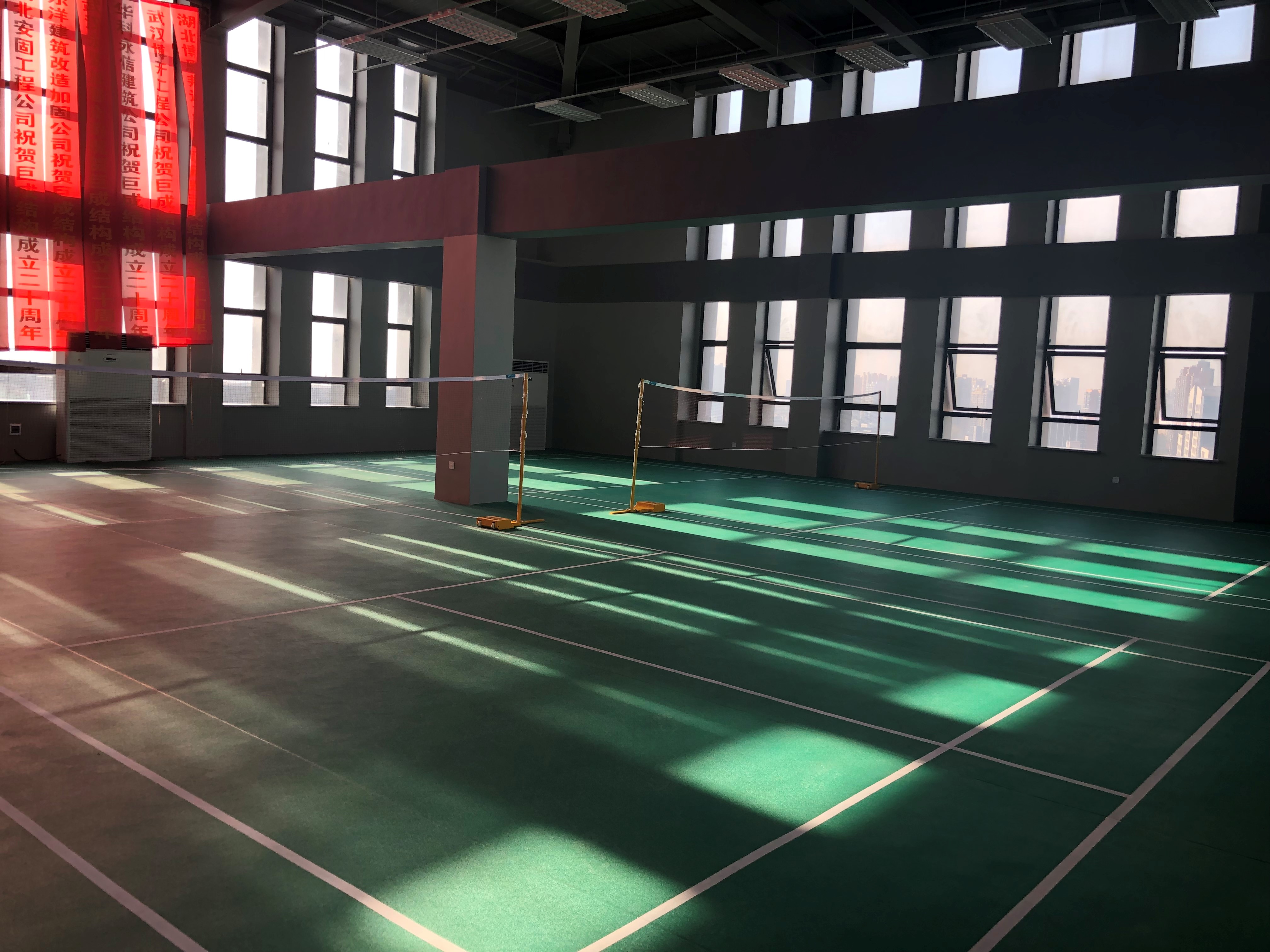 18層設置了羽毛球館、乒乓球場地、跑步機、動感單車、仰臥起坐板、臺球區(qū)等眾多健身項目,羽毛球館,地面采用專業(yè)的塑膠地面,具有防滑和緩沖作用,充分的保護員工的腳踝和膝蓋。