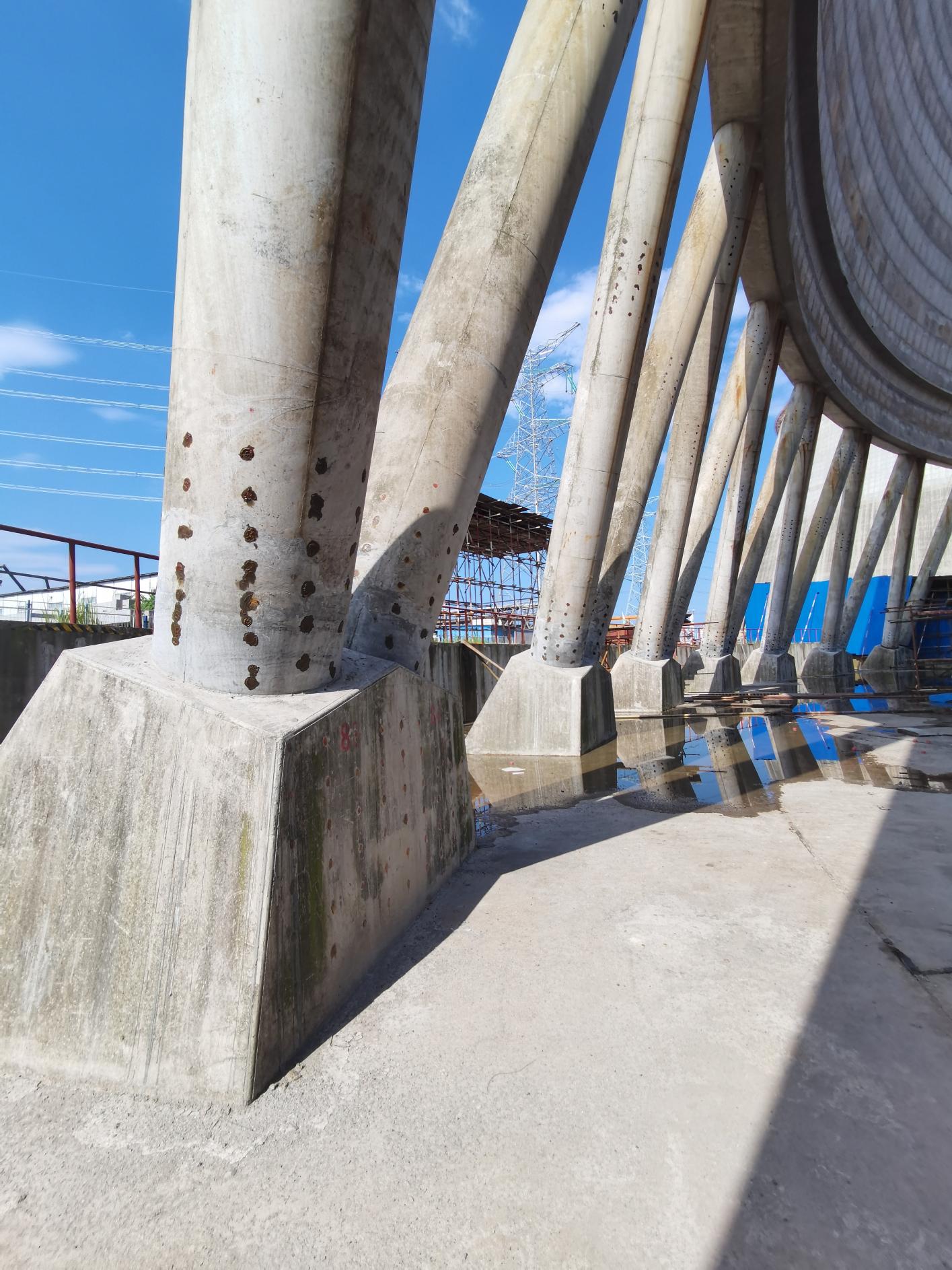 豐城電廠7#冷卻塔因發(fā)生過特大安全生產(chǎn)事故,為各方所關(guān)注。2020年復(fù)工后,巨成結(jié)構(gòu)憑借過硬的技術(shù)實(shí)力,榮譽(yù)承接了冷卻塔筒壁設(shè)計(jì)與加固工程。該工程屬于高危項(xiàng)目,開工前,巨成結(jié)構(gòu)的設(shè)計(jì)方案和施工組織設(shè)計(jì)均通過了專家論證。其中采用的多項(xiàng)巨成專有技術(shù)也得到了各位專家的認(rèn)可,如:擴(kuò)孔自鎖錨固技術(shù)保證新舊混凝土緊密結(jié)合、補(bǔ)償收縮細(xì)石混凝土保證施工質(zhì)量、便攜式鋼平臺(tái)保證施工安全、曲線施工升降機(jī)保證垂直運(yùn)輸。
