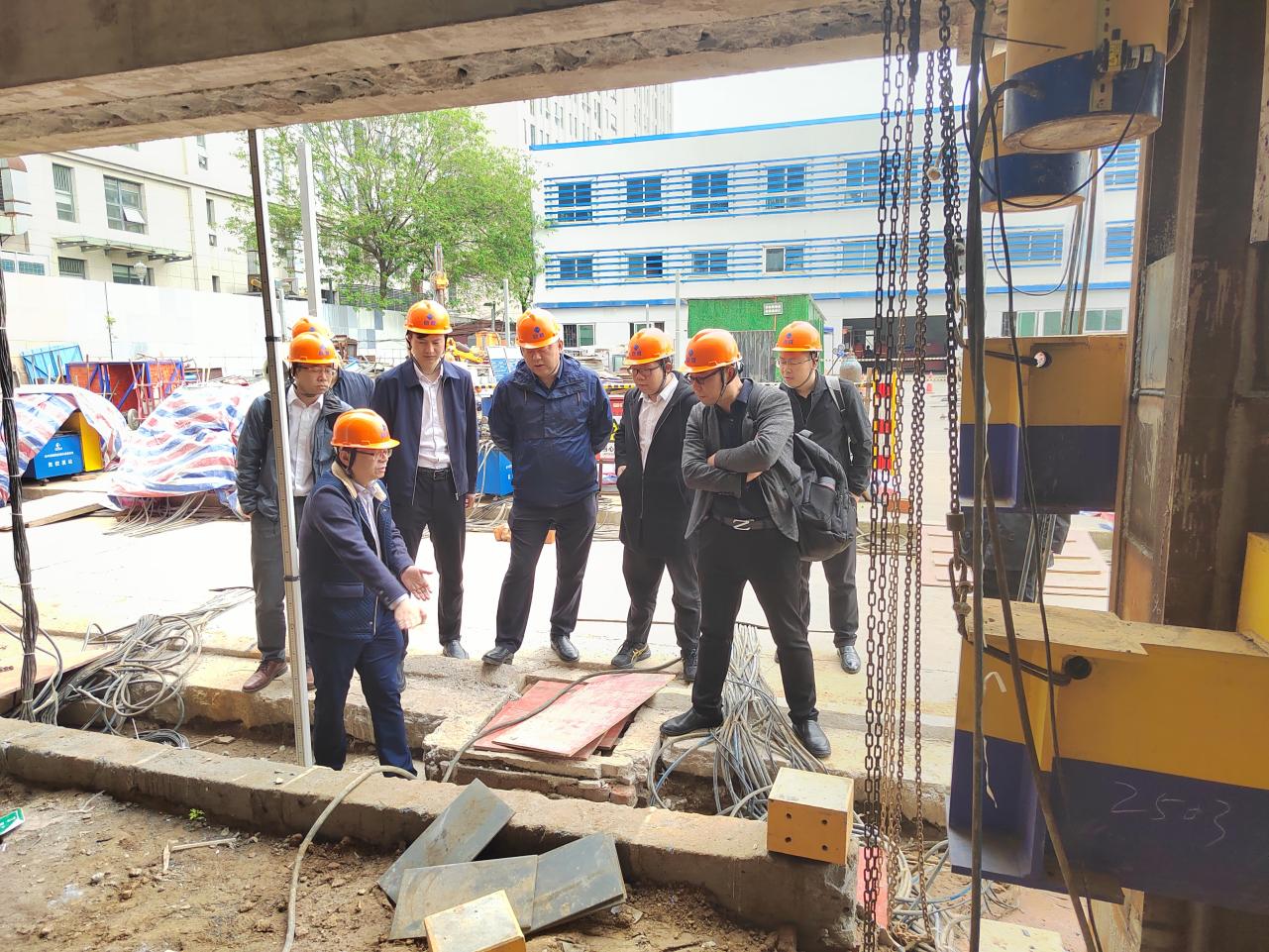 4月28日上午,中國交通建設股份有限公司旗下疏浚公司、物資公司、融資公司組團參訪巨成。來賓有中交海建中部分公司總經理張躍卿、中交海建(舟山)浚航公司總經理耿燾、中交海建中部分公司副總經理曲磊、中交物資華中分公司總經理助理王浩鈞、中交物資湖北區域經理張宇輝、中交雄安融資租賃有限公司業務一部副總經理范宏奇,大家一起參觀了巨成群控同步頂升工程試驗項目現場。巨成結構副總經理張暢詳細介紹了項目的試驗內容、試驗意義。