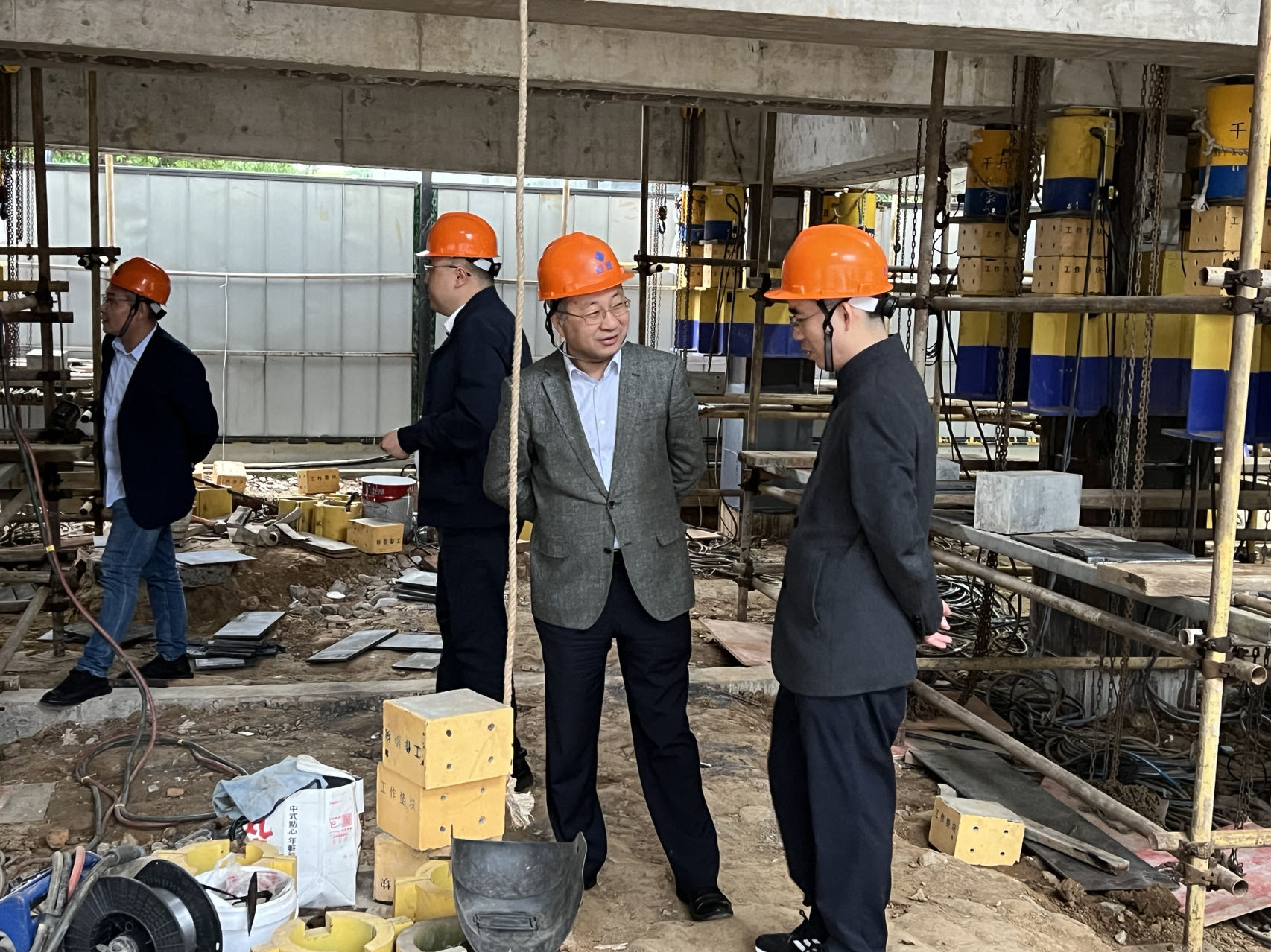 李霆董事長一行首先參觀了巨成群控同步頂升工程試驗,并就試驗過程中的相關技術要點和巨成負責人進行了深入交流。李霆董事長對巨成群控同步頂升技術非常感興趣,走進項目現場仔細考察試驗各部分內容,并詳細詢問重點技術和解決方案。