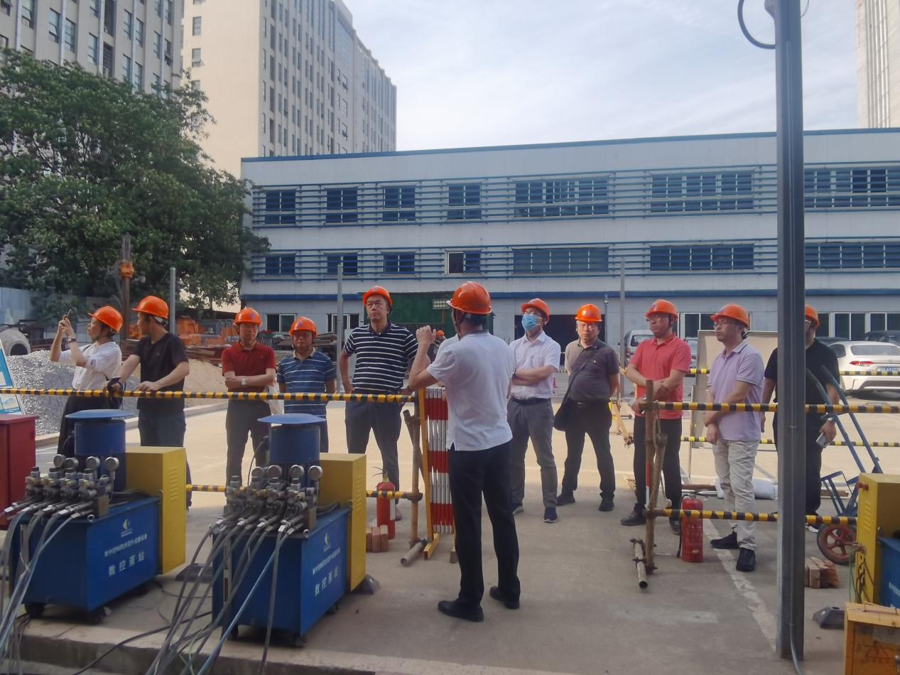 考察團一行來到巨成群控同步頂升工程試驗項目現場,巨成研究院院長助理周志勇介紹了鋼滑道頂升技術的起源與發展,本次頂升試驗的背景、目的和群控同步頂升大型數控設備以及頂升應用前景。雙方對鋼滑道頂升技術和應用場景展開了深入的討論和交流,大家一致認為巨成群控同步頂升技術技術先進,前景廣闊。