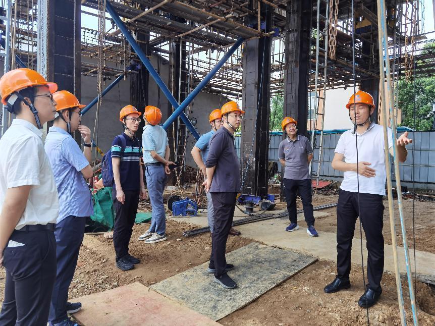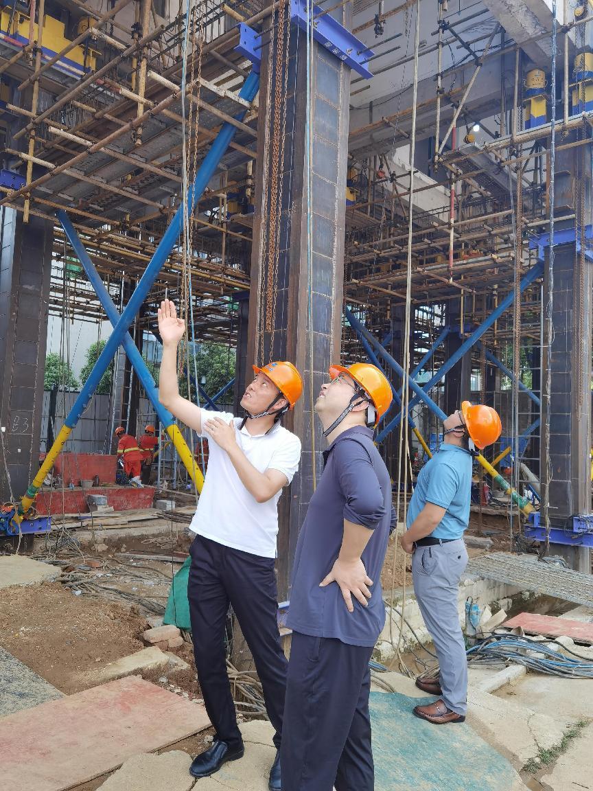 在巨成群控同步頂升工程試驗項目現場,葛總一行仔細了解了頂升試驗的過程。院長助理周志勇詳細介紹了鋼滑道頂升技術的原理和應用。雙方在現場對技術細節進行了深入交流并查看了相關數控設備,葛總對巨成在研發上所做的努力和創新表示了極大的認可。