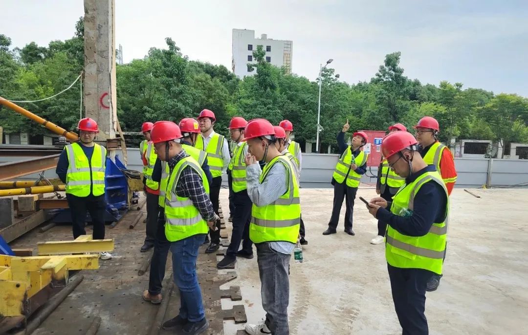 參訪團(tuán)第一站來到鄂州電廠消防站遷移項(xiàng)目,巨成結(jié)構(gòu)執(zhí)行董事盧亦焱教授陪同。項(xiàng)目現(xiàn)場(chǎng)指揮長(zhǎng)王金剛向各位來賓介紹了項(xiàng)目情況,此次遷移工程采用了巨成公司自主研發(fā)的鋼滑道剛性平面軸心旋轉(zhuǎn)法與鋼滑道頂推平移法,整體實(shí)施過程包含兩次旋轉(zhuǎn)以及兩次平移。前期已成功實(shí)施了第一階段逆時(shí)針旋轉(zhuǎn)28°、平移99米以及第二階段順時(shí)針旋轉(zhuǎn)28°的工作,目前正在進(jìn)行第二階段平移106米的施工,預(yù)計(jì)將在6月6日完成最終平移任務(wù),確保消防站精確無誤地遷移到新址。