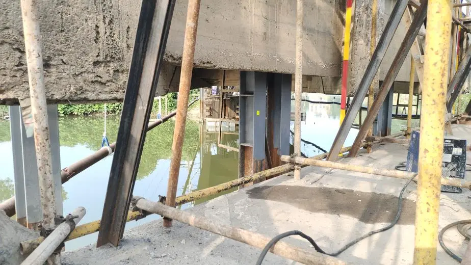 安全管控方面,項(xiàng)目部也做到了精準(zhǔn)施策:采用“分段吊繩逐級放長”的方式確保河上橋兩側(cè)的光纖管、PE水管在頂升期間基本保持在原有的水平線上,實(shí)現(xiàn)斷裂零風(fēng)險。河上橋頂升完成后,進(jìn)一步采取雙重安全保障措施,利用48mm鋼絲繩將橋段端梁與鋼構(gòu)體系的橫梁捆綁,同時在原橋臺上設(shè)置型鋼立桿做好豎向支撐,確保后續(xù)橋下施作新橋墩橋臺的空間安全。
